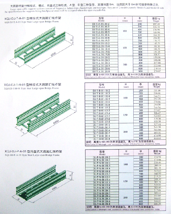大跨距橋架 大跨距匯線橋架可分為梯級式、托盤式、 槽式。 梯級式匯線橋架具有良好的通風性能,不防塵、不妨干擾。它適用于敷設計算機電纜 、通信電纜、熱電偶電纜及其它靈敏系統的控制電纜等,它對控制電纜的屏蔽干擾和重腐蝕環境中電纜的防護都有非常好的效果。
