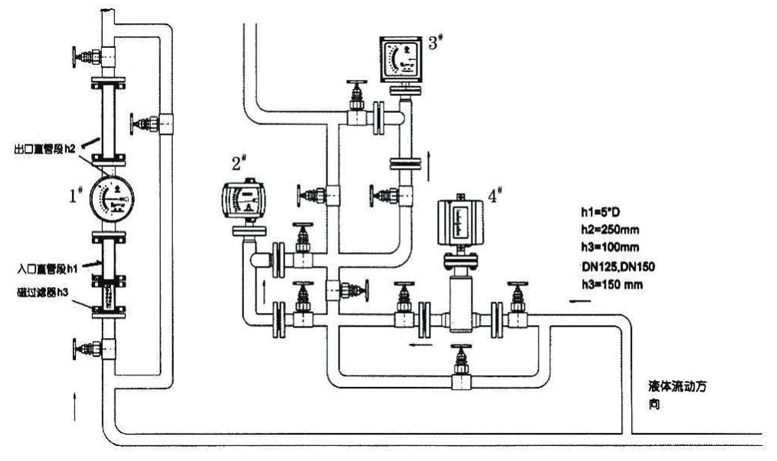 7)安裝流量計的位置應保證入口有≥5DN的直管段,出口不≤250mm的直管段;如介質中含有鐵磁性物質,應在流量計前安裝磁性過濾器。