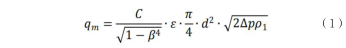式(1)中:qm--質(zhì)量流量;C一流出系數(shù);?一氣體可膨脹系數(shù);β一直徑比,B=d/D;d-工作條件下節(jié)流件的孔徑;D-工作條件下上游管道內(nèi)徑;△p-差壓;ρ1一上游流體密度。