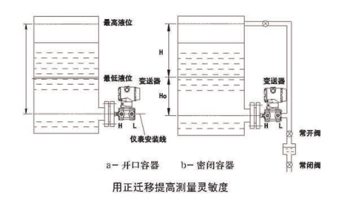變送器的正遷移適用于敞口或非敞口容器內液位的測量。安裝時正壓室連接容器接口,負壓室與大氣或者低壓側相通。
