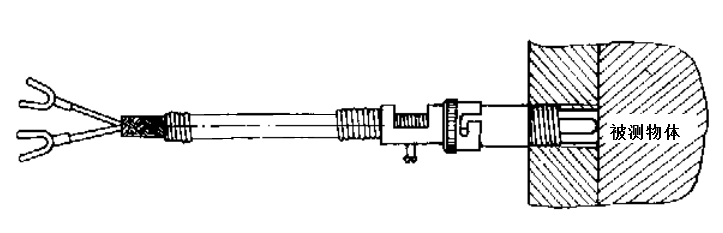 WRNT-01、WRET-01型壓簧式固定熱電偶的安裝方法如下圖所示,固定安裝在被測(cè)物體上面,先將連接螺栓擰緊在被測(cè) 物體上,再將熱電偶緊貼被測(cè)物,擰緊卡套螺釘,最后擰上鎖緊卡套。