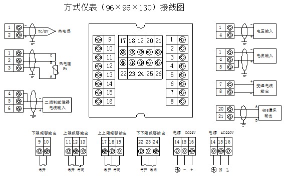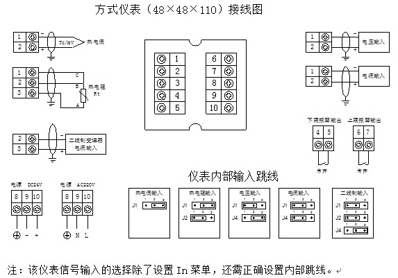 e)帶24V直流電源輸出的儀表,僅用于與二線制4-20mA輸出的無源變送器配套。該電源在儀表內部與輸入采樣電路連接,不可作為其它電源使用。